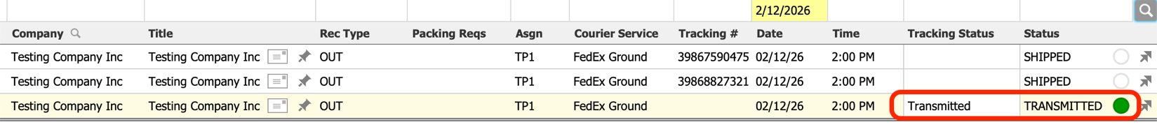 Once the NRG shipment is Shipped, the aACE Shipment is marked Shipped, the Tracking Status is blanked, the Courier Tracking # and Ship Date are populated.